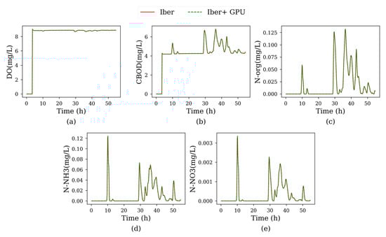 In the third case, five species (org-N, NH3-N, NO3-N, DO and CBOD) were sampled at the four control points indicated in Figure 9. For the sake of clarity, only the results obtained at P3 are shown in Figure 10, while the rest of time series are shown in Appendix D. In this simulation, the average error (⟨⟩ = 0.04%) was negligible and smaller than in the previous two cases.