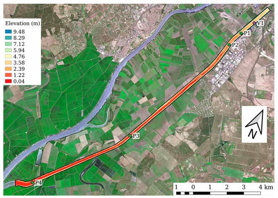 Figure 9 shows the bathymetry of the river reach under study and the location of the sewage spills. The computational domain extends over 8 km of river, with an average width of 70 m and a total extension of 0.57 km2. The domain was meshed with 8763 elements with an average size of 65 m2. The levels of the simulated species were sampled every 600 s with both models at the control points P1, P2, P3 and P4.