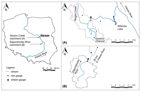 Locality map of Służew Creek (A) and Zagożdżonka River (B) catchments up to the Wyścigi and Czarna gauging stations, respectively.