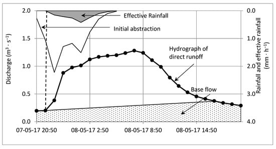 The initial abstractions were estimated based on recorded storm events (see Figure 2 and Figure 3) as the sum of the rainfall depth after which a direct runoff begins (seen as an increase in water stage and river discharge). The volume of the direct runoff was calculated based on the measured hydrograph, e.g., by indicating the event start point (increase in river discharge after the rainfall begins), the event end point (change in the slope of the hydrograph falling limb), and by removing the base flow from the total runoff. The base flow was estimated following the straight-line separation method that is described in detail by Wanielista et al. [48]. The computed volume of the direct runoff was next divided by the catchment area, giving the runoff depth for each storm event. As the rainfall depth, the direct runoff, and the initial abstraction are known (measured or estimated), Equation (3) may be solved for the maximum potential catchment retention: S. Finally, the initial abstraction ratio was computed from Equation (4) for each recorded storm event. This technique of Ia estimation has been used in previous studies such as Shi et al. [8] and Ling et al. [49].