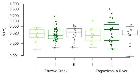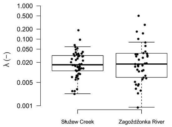 The values of λ for individual events are presented in Figure 4. In the case of the Zagożdżonka River, the data are more dispersed, meaning that the variation in λ for different storm events was higher than for the Służew Creek catchment. However, whereas the mean values varied for both catchments, the median values are similar, i.e., 0.017 and 0.018, respectively, for Służew Creek and Zagożdżonka River.