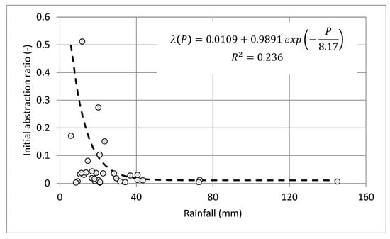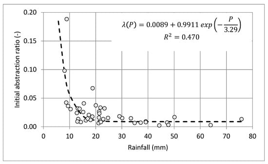 The same procedure was repeated for the Zagożdżonka River, resulting in 32 summer events and the results are plotted in Figure 7. In this catchment, a greater variation of λ (especially for low rainfalls) was observed than for that in the Służew Creek catchment (compare with Figure 6). Although the relationship between the initial abstraction ratio and the rainfall depth was in this catchment less pronounced, a similar tendency to the Służew Creek catchment could also be observed here, i.e., a constant value of the initial abstraction ratio approaching 0.0109 for rainfalls with the rainfall depth higher than 20 mm may be noticed. For the case of the Służew Creek catchment, the coefficient of determination (R2) equaled 0.470 and for the Zagożdżonka River catchment it was 0.236.