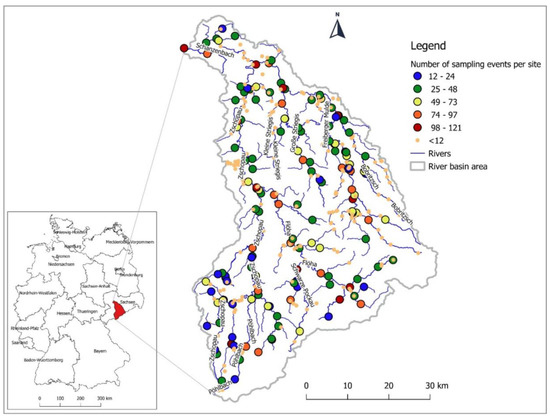 Location map of the study area with number of sampling events per water quality monitoring (WQM) site during the monitoring period of 2006 to 2016 on the Freiberger Mulde river basin in eastern Germany.