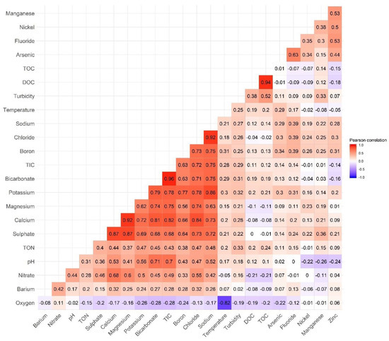 PCA does not explicitly account for the redundancy of correlated variables. To further reduce the number of monitoring parameters, Pearson’s correlation coefficients for all 23 parameters were computed for the entire monitoring period (Figure 3). If the correlation coefficient is between 0.9 and 1 (or −0.9 and −1), the two variables are highly correlated and can be represented by a linear relationship. Thus, for the paired variables that have correlation coefficients of more than 0.9, one of them could be discarded to reduce the redundancy of the information, e.g., Cl− − Na+ (0.92), HCO3− − TIC (0.96), Ca2+ − Mg2+ (0.92), and DOC − TOC (0.94), with the variable of higher loading on the principal component being kept. Consequently, combining the PCA results and Pearson correlation analysis, four parameters (Na+, HCO3−, Mg2+, DOC) can be further discarded. As a result, 14 variables (Boron, Calcium, Chloride, Potassium, Sulphate, TIC, Fluoride, Arsenic, Zinc, Nickel, Temperature, Oxygen, TOC, and Manganese) now explain 75% of the total variance, and therefore, should remain under observation.