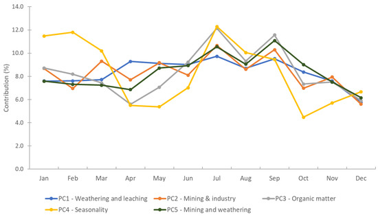 The temporal variability of each principal component was analyzed according to the monthly contributions of each observed component, and calculated using the total amount of observations. The contribution per component over a 12 months period was summed up to 100%; if each month shows an equal contribution, the period of time sampled shows a negligible impact on that component. A fluctuation in contributions over several months indicated that the component is subjected to temporal variation, with a higher contribution suggesting the influence of the time period. Figure 5 shows the contribution over the entire monitoring period of 12 months (January to December) for the first five components. The first component (PC1) remains almost constant over the 12 months, with a minor contribution shift observed during the cold season of November to March, potentially because the rate of chemical weathering decreases with the decreasing temperature [46]. This also indicates the minor influence of the sampling months on the mineral contents in the FM river basin. For the second component, a weak point is shown during warm periods, accompanied by a peculiar pattern of higher and lower contributions, differing from month to month, with low contributions in even months and high contributions in odd months. While the reason for this oscillating contribution remains unclear, the observations suggested that the monitoring schemes favored odd months over even months. The fluctuations in components three and four are quite similar: in PC3, the maximum variation of organic matter is observed in July (12.1%), which is almost twice the contribution of April (5.6%) and December (5.9%). The higher contribution of organic matter from June to September could be related to lower and more variable flow during summertime. In PC4, the extreme warm (July to September) and cold months (January to March) play a bigger role than the milder months of April, May, and October in demonstrating the variation. The fifth component resembles patterns of the first and second component, with less seasonal variation of manganese in the FM river basin.