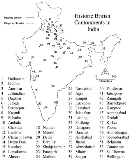 Map of Historic British Cantonments in India, c. 1864, after Kalal [] (p. 28b) and Kulkarni [] (216) by Miles Scheuering, University of Montana, USA.