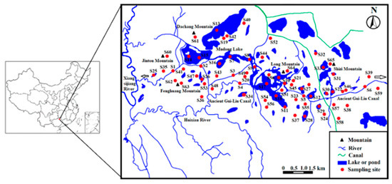 Huixian wetland, located in the northeast of Guangxi, with an area of 587 hm2, is the greatest wetland of karst areas in China. It forms a complex ecosystem consisting of lakes, marsh, rivers, ponds, and artificial canals [27,28], as shown in the map presented in Figure 1. The mean annual temperature is 16.5–20.5 °C, and the average rainfall 1890 mm, yearly. Since the 1950s until 2012, when it was listed as a national wetland park, the wetland has been damaged. These damages were especially landuse changes and conversion of natural lands to aqua/agricultural lands continually, because of the increased manmade changes, the poor management, as well as lack of efficient protections. These have gradually caused the wetland water areas and its connected ponds shrinkage, and therefore, the ecosystem of the wetland has been critically impacted. Currently, the entire area covered by water is just around one square kilometer [28]. The large grassy areas around the wetland have been recently opened up to about 130 hm2 of farmland, and the marshes have been excavated to 280 hm2 to convert to fish farms [26].