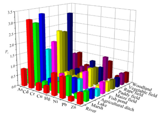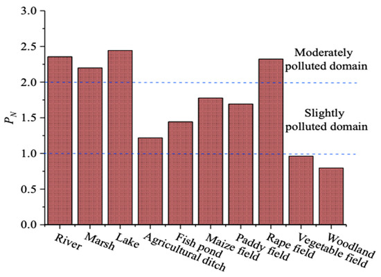 The Nemerow’s synthetical contamination index (PN) result, which is based on the single pollution index (Pi), revealed that the river, marsh, lake, and rape field were moderately contaminated with PN values of higher than 2.0, but the fish pond, maize field, paddy field, and agricultural ditch were slightly contaminated with PN values of higher than 1.0 (Figure 4).