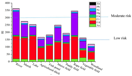 The potential ecological risk index (RI) calculated for contaminants in our work is shown in Figure 5. Samples from the river and rape field were found to pose the highest ecological risk (300 ≤ RI < 600), while in woodland, showed the lowest ecological risk (RI < 150), and the rest posed a moderate risk (150 ≤ RI < 300). According to the RI index, Cadmium was found to have a considerable potential ecological risk (80 ≤ Eir < 160) in the river, marsh, lake, fish pond, maize field, paddy field, rape field, while moderate risk (40 ≤ Eir < 80) in the agricultural ditch, vegetable field, and woodland. Also, Hg was shown to pose a high potential risk (Eir between 160 to 320) in the river, considerable risk (Eir between 80 to 160) in the marsh, maize field, and rape field, but moderate (40 ≤ Eir < 80) in the rest of the landuse types. In addition, all other heavy metals posed a low potential risk (Eir < 40) in different landscapes.