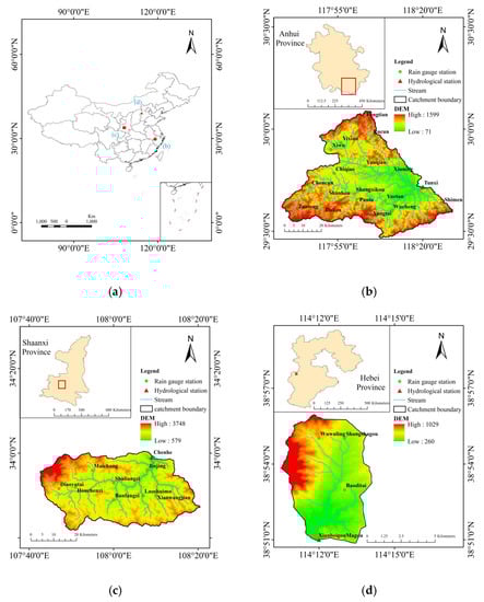 Locations, elevations and river networks of the study areas: (a) their locations in China, (b) Tunxi Catchment, (c) Chenhe Catchment, and (d) Xianbeigou Catchment.