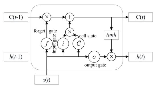 LSTM, proposed by Hochreiter and Schmidhuber [42], was an adapted version of RNN to address problems of exploding or vanishing gradient and later were refined or simplified [43]. This method can preserve information over long periods through its unique structure, cell state, and gates to control how the information flows in the different layers. The structure of the LSTM is shown in Figure 2. Equations are as follows: