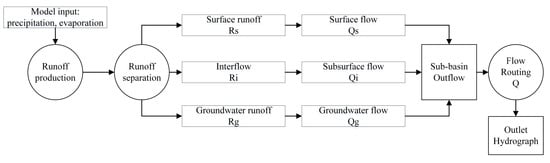 The XAJ model [44,45] is a conceptual rainfall–runoff model that has been successfully and widely used in humid and semi-humid regions of China. The flowchart of the XAJ model is shown in Figure 3 [46].