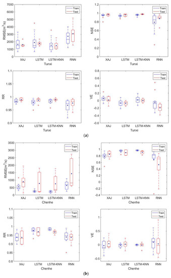 First, the performance of LSTM and RNN models are evaluated in Section 4.1. In Section 4.2, the LSTM model is compared with the XAJ model to explore the similarities of these two models. Finally, in Section 4.3, we discuss the effectiveness of the proposed LSTM-KNN model relative to the LSTM model. Results in terms of the four evaluation metrics in all study areas for the testing and the training set are summarized in Table 1. The boxplots of the statistics of RMSE, NSE, R2, and VE for each flood event in the three study catchments for training and testing are displayed in Figure 5.