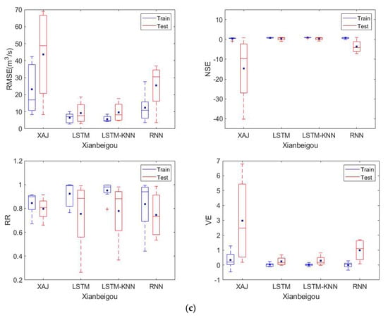 Boxplots for four models (XAJ, LSTM, LSTM-KNN, and RNN) of RMSE, NSE, R2, and VE in Tunxi, Chenhe, and Xianbeigou Catchment. (a) Tunxi; (b) Chenhe; (c) Xianbeigou.