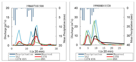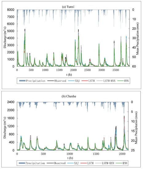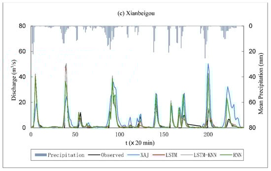 We compared and discussed the performance of the four models in selected catchments. In comparison to previous studies in the humid catchment, i.e., Tunxi, Yao [37] found NSE of 0.94 (i.e., for training sample) and 0.95 (i.e., for testing sample) from XAJ and improved Xinanjiang coupled with geomorphologic instantaneous unit hydrograph (XAJ-GIUH) models using time series data from 1983 to 2003. However, we found higher accuracy with NSE of 0.96 (i.e., for training sample) and 0.98 (i.e., for testing sample) from the LSTM-KNN model using data spanning from 2008 to 2016. Huo [38] classified the flood events in Chenhe catchment in the same period as this study into low-flow, medium-flow, and high-flow events and utilized six hydrological models to simulate the flood events while applying the Bayesian model averaging (BMA) approach to improve flood prediction. The NSE value of the selected flood events for testing sample was 0.86. In comparison, our LSTM model showed better model prediction ability in Chenhe with an NSE of 0.93 for the testing stage, which suggests the superiority of the LSTM model. In another study, Chao [39] established the CASCade Two Dimensional SEDiment (CASC2D-SED) model in Xianbeigou Catchment; the coefficient of determination (i.e., a similar metric with NSE) of eight flood events was greater than 0.7 with an average of 0.85, and the accuracy of simulation results was higher than that of LSTM found in this study. This is because the CASC2D-SED model utilizes the Greet-Ampt formula to simulate surface flow, which is suitable for this area with steep hydrographs that show the infiltration–excess mechanism.