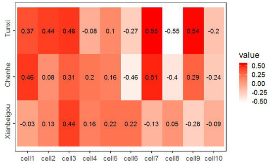 Frederik [56] proposed that the correlation between the LSTM model and the conceptual model could be calculated to see if there is a strong relationship between the cell values of LSTM and states variables of other hydrological models. Similarly, we extracted the cell states of LSTM and the tension water W representing the soil moisture in the XAJ model. Considering that the input in the LSTM model was normalized to be fed into the model, the absolute value did not contain physical meaning. Therefore, the correlation of these two variables could be examined to ascertain if the cell states had the same function as the state variable W from the XAJ model.