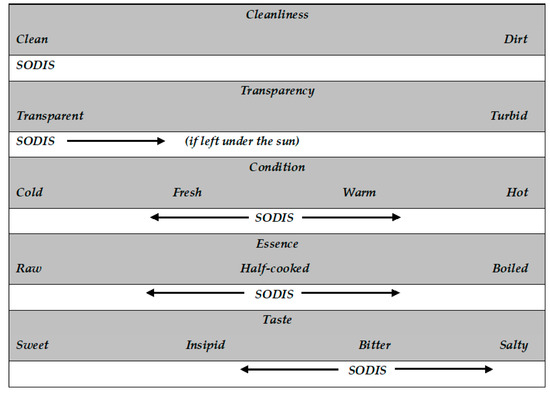 Participants used very specific terms—with either positive or negative connotations—to define the taste of drinking water: ‘sweet’, ‘insipid’, ‘bitter’, and ‘salty’. They remarked that ‘raw’ water was the most valued type in terms of taste (‘sweet’), and the least valued types were ‘salty’ and ‘bitter’ waters (i.e., ‘raw’ smelly water of stagnant ponds). Participants argued that the process of boiling or preparing SODIS water caused irreversible alterations of taste in particular. They indicated that water lost its ‘sweetness’ and became ‘insipid’, ‘bitter’, or ‘salty’. Respondents asserted that SODIS water did not have any of the positive attributes of ‘raw’ water, but they considered it slightly more pleasant than boiled water, which they described as ‘tasteless’ and ‘unpleasant’ (Figure 1).