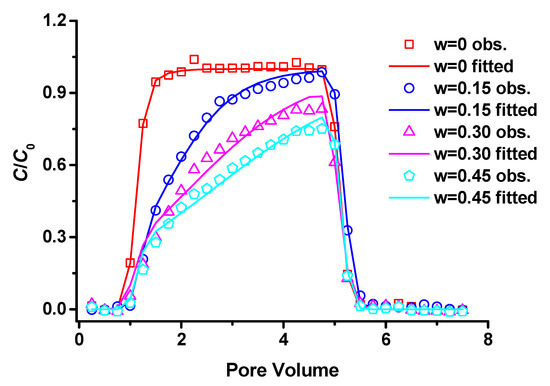 In the present study, the pore–water velocity and longitudinal dispersity of packed column were obtained by fitting tracer BTCs using the CXTFIT code [27]. The convection–dispersion equation with two kinetic retention sites [28,29] was used to describe the experimental BTCs of GO and Cu-loaded GO in saturated porous media. It is assumed that the first site is reversible using the first-order retention rate coefficient (k1d) and detachment rate coefficient (k1det), while the second site is irreversible and accounted by the first-order retention rate coefficient (k2d) and a Langmuirian dynamic blocking function [30]. The HYDRUS-1D code [31] was applied to numerically estimate the transport parameters of GO and Cu-loaded GO by inverse fitting the experimentally observed BTCs with a non-linear least square optimization routine based on the Levenberg–Marquardt algorithm [32]. A detailed description on the model equations of the two-site kinetic retention model can be found in our previous work [9,10,22] and in Text S4 of the Supplementary Materials.