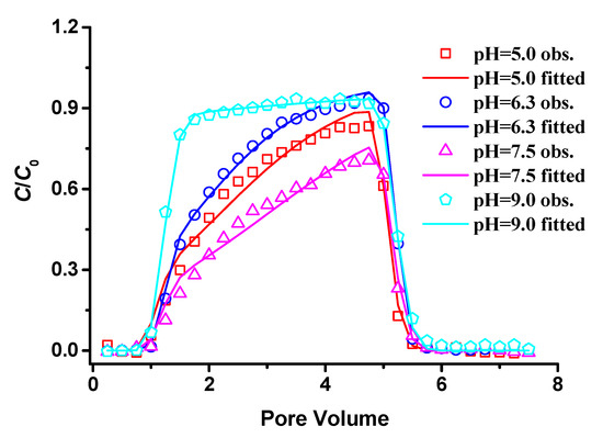 Observed (dots) and simulated (solid lines) breakthrough curves (BTCs) of GO at different solution pH as ω = 0.30 and IS = 1.0 mM KCl. Symbols are experimental data and solid lines are the fitted results obtained from the two-site kinetic attachment model.