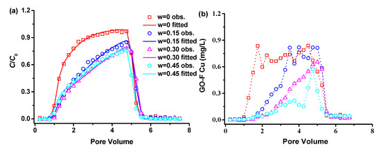 The working GO influents (20 mg L−1) with or without 0.05 mM of Cu2+ were injected for 4.0 pore volumes (PVs) at an identical flow rate, followed by introducing 3.5 PV of background solution (i.e., 1 mM KCl). The column effluents were collected at predetermined time intervals using a fraction collector ((BS-100A, Huxi Analytical Instrument Factory Co., Ltd., Shanghai, China). The concentration of GO in the effluent was analyzed spectrophotometrically (721‒100, Shanghai, China) at the optimal wavelength of 228 nm [9,10]. For cotransport experiments, aliquots (5 mL) of outflow solutions were centrifuged (11,000× g, 30 min) and filtered through a 0.22-µm membrane filter to measure the dissolved Cu concentration in the filtrates using AAS, as described above and in Text S2 of the Supplementary Materials. The GO facilitated (GO-F) Cu was calculated by the difference between the total and dissolved Cu2+ ions. All breakthrough curves (BTCs) of GO were plotted as normalized effluent concentrations (C/C0) as a function of injected pore volumes (PVs).