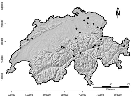 Locations of the springs sampled in Switzerland (n = 71). Some sites were in close proximity; therefore, points overlap.