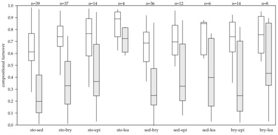 Compositional turnover between different substrates within the same spring calculated with the Jaccard similarity coefficient. White boxes show the similarity between counted samples where only counted abundances were considered. Gray boxes show the similarity between estimated samples where species richness was estimated according using the Chao similarity coefficient. Substrates: Bry = Bryophytes, Sed = Sediment, Sto = Stones, epi = epiphytic on filamentous green-algae, lea = leaf litter, all = cumulative species richness of all substrates at the site. The lower edge of the grey boxes shows the 1st quartile, the upper edge the 3rd quartile, and the line in boxes shows the median.