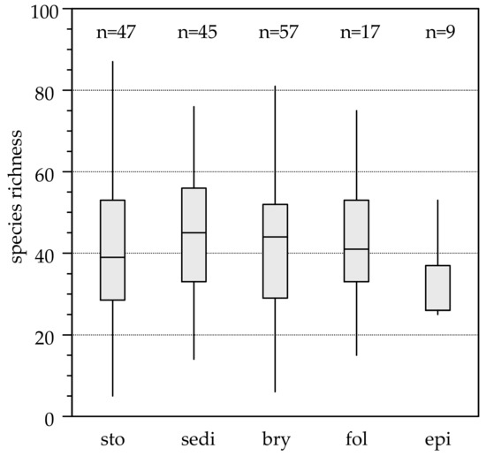 Species richness for each substrate. Mean species numbers per microhabitat were: stones = 39, sediment = 45, bryophytes = 43, epiphytic on filamentous green-algae = 39 and leaf litter = 32. Substrates: sto = stones, sed = sediment, bry = bryophytes, epi = epiphytic on filamentous green algae, lea = leaf litter. The lower edge of the grey boxes shows the 1st quartile, the upper edge the 3rd quartile, the line in boxes shows the median, and the whiskers show the minima and the maxima.