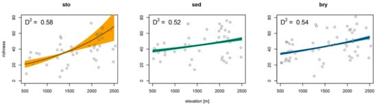Understanding the factors that drive gradients of species richness is one of the major challenges of ecological and biogeographical research. To investigate patterns of species richness and the related environmental drivers, elevational gradients have received considerable attention in the last decade, and have become firmly established as a replicable methodology [,,,]. Elevational richness patterns across a wide range of taxa can show a variety of response shapes to the gradient, from monotonic declines to more or less hump-shaped patterns, with maximum richness at some intermediate point of the gradient [,,]. For microorganisms, patterns of species richness along elevational gradients can, however, contrast with those of macroorganisms [] and the determinants of elevational distributions of microorganism species richness are still poorly understood. Studying microorganisms along elevational gradients might therefore provide important insights into the processes determining species richness along elevational gradients. Moreover, different aspects of biodiversity can be driven by different main factors: Wang et al. [] for instance, found for stream diatom assemblages along elevational gradients in Asia and Europe that richness was mostly related to pH, while evenness was mostly explained by total phosphorus.