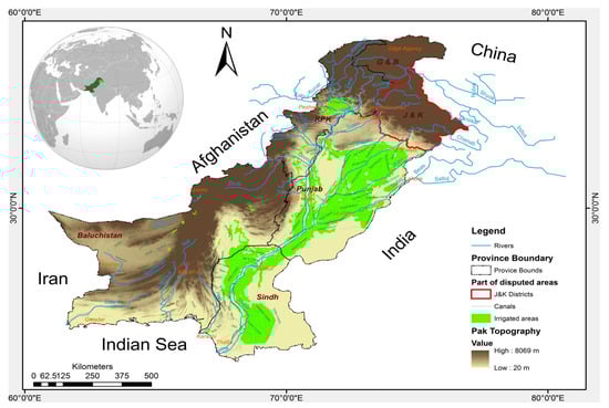 Most water is consumed by the agricultural sector. According to Blomquist and Ingram [], out of the total available freshwater resources, 94% (196.79 km3) is used by the agricultural sector, 5% (4.71 km3) by municipalities, and only 1% (1.36 km3) is withdrawn by the industry [,]. This requirement of 202.85 km3 is likely to increase to 217.78 km3 by 2025. The economy of Pakistan depends heavily on agriculture. Of Pakistan’s labor force, 44% is employed in agriculture, which contributes 21% to the GDP. Agriculture and agro-based products account for 75% of the country’s total export earnings []. Two-thirds of the entire Pakistani population lives in rural areas, and agriculture is the main livelihood for them []. During the last 72 years, the total cultivated area of Pakistan has increased by about 50%, while the population has increased almost five times. The urban areas have expanded over seven times, and this has put pressure on cultivated land [].