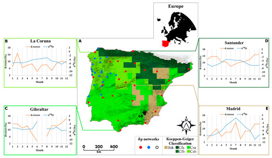 The Iberian Peninsula is located in the mid-latitudes of the Northern Hemisphere between the Mediterranean Sea and the Atlantic Ocean. Four major climate zones may be delineated on the peninsula (Figure 1A). The greater part might be categorized as warm temperate, with dry, hot, or cool summers (Köppen codes: Csa/Csb, respectively; Figure 1A), where dry hot summers are dominant (Csa;), and the value of δp had risen to around zero during the light summer rains (Gibraltar, Figure 1C). The values of d-excess (d = δ2H – 8 × δ18O, [1]) indicate an intra-annual trend with the minimum being reached in mid-summer.