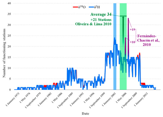 Monthly δp values were acquired from 32 Iberian stations of the Global Network of Isotopes in Precipitation (GNIP). The available data were unequally distributed in time and space (Figure 1 and Figure 2). Historically, after Gibraltar, the second station was Faro, while the GNIP network on the peninsula became spatially extensive after May 1988, with 10 stations. Between 1992 and 1998, the number of simultaneously operating stations once again fell to ~5. The number of operating stations was usually ≥15 between 1998 and 2011, after which once more, only two stations, Gibraltar and Riells, were gathering samples [23]. The point at which the network was at its most extensive was in January 2003, when 24 monitoring sites were operating simultaneously (Figure 2). In the period assessed here (October 2002–September 2003), the same number of data were generally available for both water stable isotopes, although, in certain cases, the δ18O records were more abundant (red line in Figure 2).