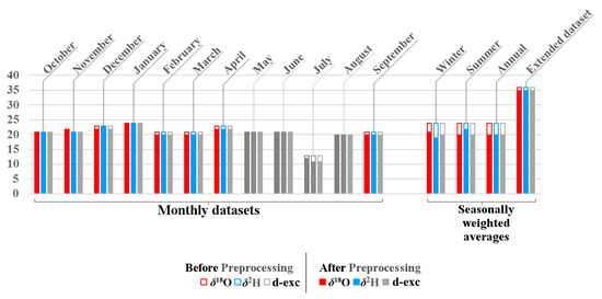 The number of precipitation stable isotope records in the initial monthly and multi-monthly datasets before and after preprocessing entered into the semivariogram analysis. Winter: October–March; summer: April–September. Grey bars represent the months omitted from the analysis, see text for details. The open part of a column indicates that some values were discarded after the quality check of the raw data (see Section 2.3.2).