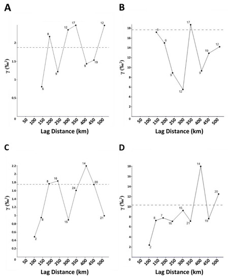 Empirical semivariograms of δ18Op and d-excess for March 2003 (A, B, respectively) and December 2002 (C, D, respectively). The semivariograms from the March data are of the nugget-type, while the December ones have a rising section. The numbers next to the empirical semivariogram (black dots) show the data pairs within a given distance (bin width was 54 km) behind the semivariograms. The dashed line indicates the average variance.