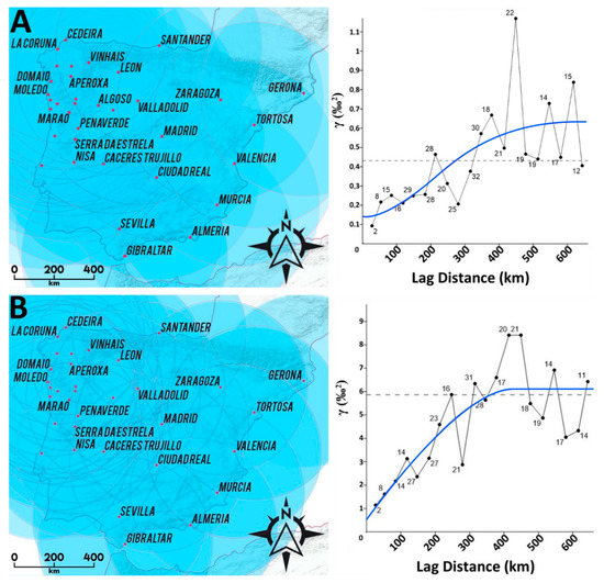 The basic function of geostatistics, the variogram, was used to explore the spatial autocorrelation structure of δp and d-excess in the Iberian Peninsula. The empirical semivariogram might be calculated while using the Matheron algorithm [45], where is the semivariogram and and are the values of a parameter sampled at a planar distance from each other