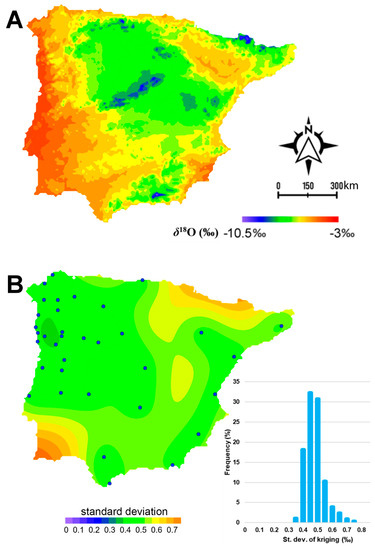 The δ18Op values that were indicated by the obtained isoscape range between −10.55 and −3.97‰ (Figure 6A). The estimations error is < 0.5‰ at the stations, while the largest error (~0.75‰) is obtained in areas where station data were not available (as usually observed, see [14]) e.g., in the northern (Pyrenees) and SW part of the peninsula (Algarve) (Figure 6B). A similar pattern is seen for δ2Hp with values ranging from −76.6 to −21.1‰ (Figure S6A) and estimated errors up to 6‰ (Figure S6B).