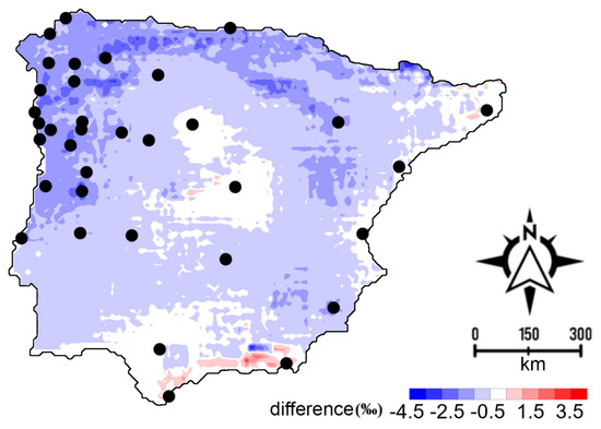 Difference map of the Iberian subset of the regionalized cluster-based water isotope prediction (RCWIP) model and the one presented in the study. For each grid point the values of the Iberian δ18Op isoscape (Figure 6A) were subtracted from the RCWIP model. Grid resolution: 10 × 10 km, black dots represent the precipitation sampling sites used in the geostatistical analysis representing October 2004–July 2006.
