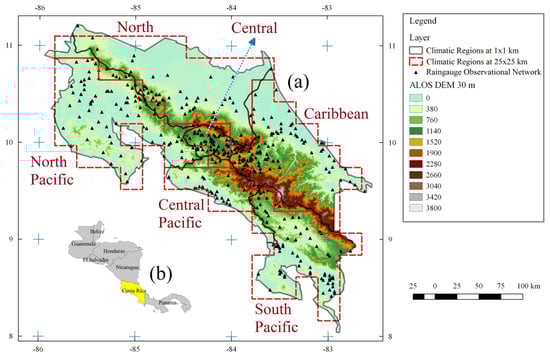 (a) Rain-gauge observational network and Digital Elevation Model (DEM) for each climatic region in Costa Rica during the period 1951–1995. (b) Position of the Costa Rica within the Central American isthmus.