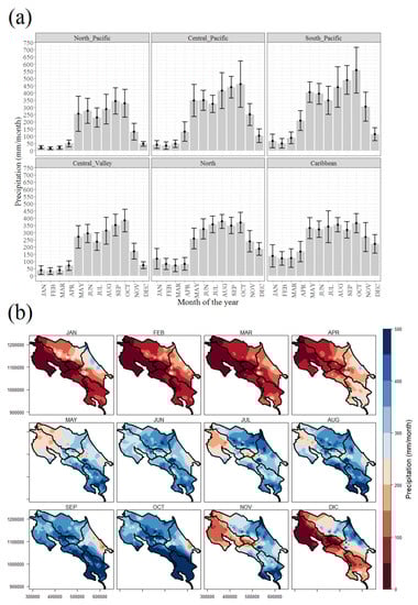 (a) Spatially-averaged mean monthly precipitation for each climatic region of Costa Rica based on 1951–1995 grid climatology. Error bars represent the standard deviation. (b) Same as (a) but spatially-distributed.