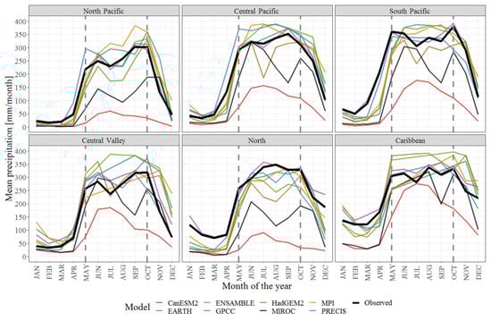 Spatially-averaged observed and uncorrected GCM-RCM annual cycle of precipitation during the period 1951–1995 for all climatic regions of Costa Rica.