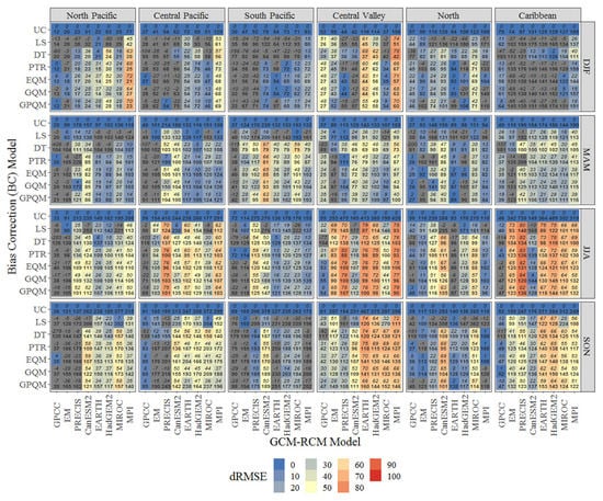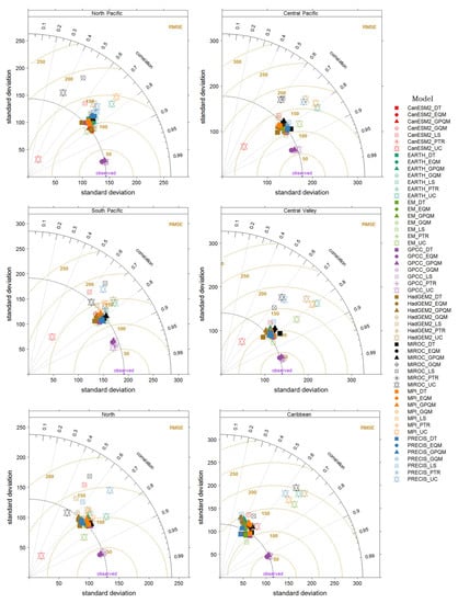 The full amount of these complex factors could also explain why DT, being simpler than the remaining BC methods, normally exhibits better performances than more complex methods such as EQM or GPQM for the North and Caribbean regions, which could also be limited to monthly temporal resolution data as suggested by Yang et al. [], Shrestha et al. [] and Hanel et al. []. Nevertheless, the diminished GCM-RCM model performances in terms of R and PBIAS does not necessarily indicate severe model biases but rather shows that GCM-RCM pairs cannot properly reproduce JJA monthly deviations within the annual precipitation distribution cycle. In relation to the GPCC dataset, only the Central-Valley region shows clear improvements in terms of RMSE, MAE and PBIAS when corrected by EQM, PTR or GPQM, all of which yield comparable results. For the remaining climatic regions however, GPCC does not benefit from bias correction irrespectively of the BC method applied, this indicates that bias correction is more effective for the GPCC during the dry season and little added value is gained during the rainy season.
