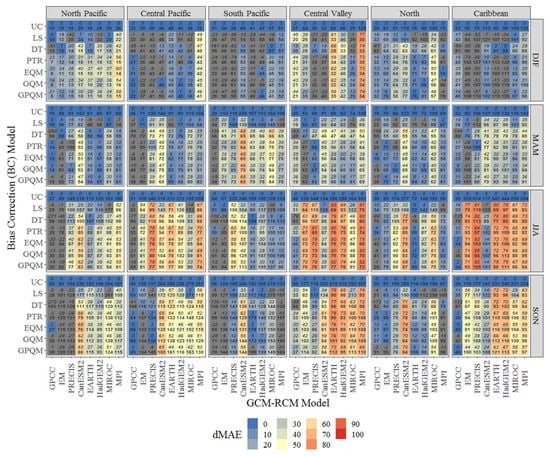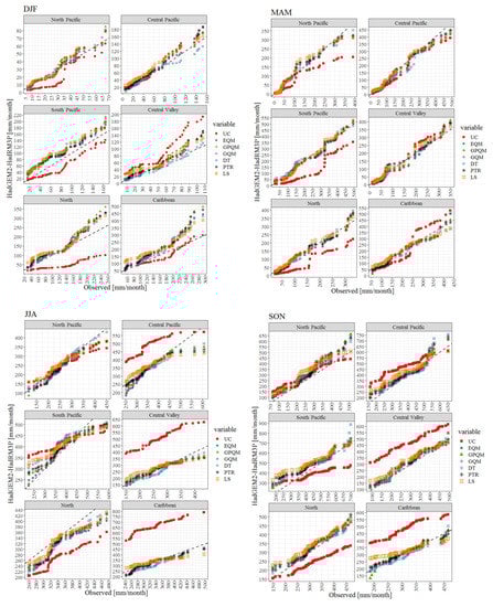 Uncorrected GCM-RCM R values are generally lower than their bias corrected counterparts, suggesting than BC values better represent the temporal and spatial patterns of precipitation over Costa Rica. Moreover, SD values of uncorrected GCM-RCM pairs vary significantly across climatic regions, showing marked spatial and temporal heterogeneity. The uncorrected ensemble-mean usually exhibits better performance compared to individual uncorrected GCM-RCM pairs. The ensemble-mean also benefit from bias correction application but there is a tendency to over-adjust SD values by most BC methods in the South-Pacific region. Reasonably higher R values (between 0.70 and 0.85) and lower RMSE values (100 to 125 mm/month) are achieved after bias corrected for most climatic regions except for the Caribbean, where R values in fact decrease from a range of 0.60–0.70 to values below 0.50, even though RMSE values are substantially reduced. This indicates that uncorrected GCM-RCM pairs encounter limitations in properly capturing the spatiotemporal variability of precipitation over the Caribbean climatic region and BC methods are for instance even less effective. In addition, uncorrected RMSE and MAE values are also usually higher for RCA4 models, particularly along the Caribbean coast where the year-round persistent precipitation pattern, associated with cold air outbreaks and frontal systems advect precipitation is clearly not properly described by RCA4 models. Since BC methods results vary substantially across temporal and scales, seasonal heatmaps of performance metrics are presented in terms of root mean square error (RMSE), mean absolute deviation (MAE), correlation coefficient (R) and percentage bias (PBIAS) for the entire dataset (Figure 6, Figure 7, Figure 8 and Figure 9), along with Q-Q plots of uncorrected and bias corrected ensemble-mean data against observations (Figure 10).