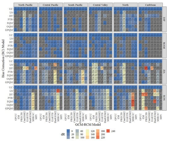 Spatially-averaged percentage bias (PBIAS) performance of uncorrected and bias-corrected precipitation during the validation period 1981–1995 for all climatic regions of Costa Rica. Scale-color represents the PBIAS absolute percentage change (%) after bias correction. Negative values are presented in grey.