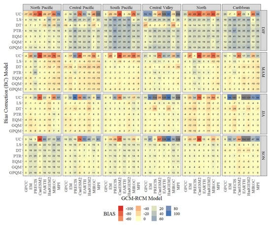 One of the factors contributing to such a tendency is the locally intense convective activity of JJA precipitation across most of the Central-American Caribbean coast [,], which in this case most GCM-RCM models fail to capture and for instance, BC methods render less effective. In general terms, the diminished R and PBIAS performances for these two regions are most likely related to GCM-RCMs difficulties at representing predominantly convective precipitation during JJA; a situation that has largely been identified and investigated [,,,]. On the other hand, GCM-RCM pairs can also suffer from considerable systematic biases of the precipitation field in orographic terrain such as Costa Rica due to the windward and leeward effects imposed by the northwest-southeast trending cordilleras, producing overestimation on the windward side and underestimation on the lee side [,].