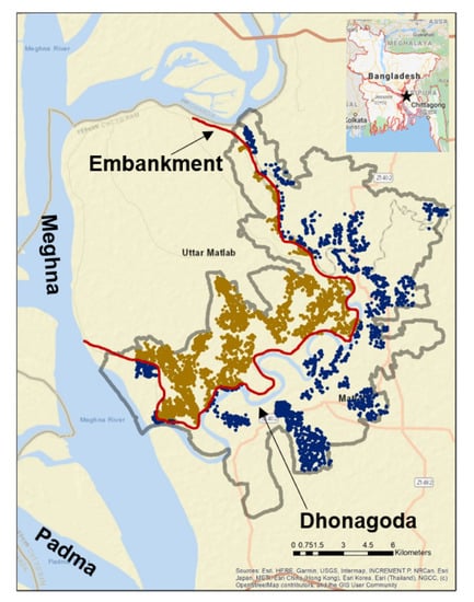 The Meghna–Dhonagoda Irrigation Project (MDIP) is one of the largest flood control, drainage and irrigation projects in Bangladesh, implemented in 1988 with the objective to protect the area in Matlab North from river flooding and drainage congestion during the monsoon via embankment and regulators. The primary aim was to improve agricultural conditions in monsoon, with special reference to encouraging introduction to high yielding variety (HYV) monsoon rice (Aman), and also to provide irrigation from surface water in the Rabi (dry) season and early monsoon seasons. Located 55 km south-east of the capital city Dhaka, the study area is 184.4 km with a population of 230,185 as of 30 June 2014 []. The Dhonagoda river bisects the area into Matlab North and Matlab South. The embankment protects the Matlab North area from flooding from Meghna river on the north and west and Dhonagoda River on the east and south (Figure 1).
