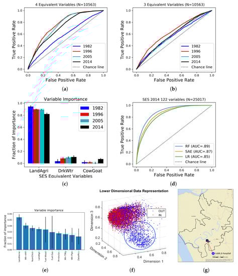 Inside vs. outside embankment classification outputs based on socio-economic survey data using (a) four equivalent variables across four years, (b) same as (a) excluding boat ownership variable, (d) 122 variables from 2014 survey, (c) top three, and (e) top ten discriminating variables identified by Random Forest classifier in respectively (b) and (d). (f) lower-dimensional representation of SES 2014 data, and (g) the location of households, corresponding to the cluster inside the blue circle, in the study area.
