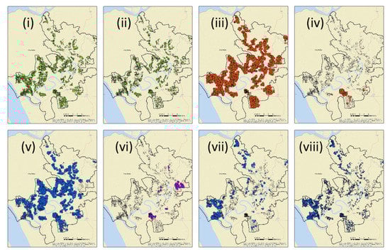 Selected variables from socio-economic survey data. Responses aggregated over bari. (i,ii) Homestead vs. agricultural land owned, (iii,iv) primary fuel source is wood/wood dust/paddy husk vs. gasline, (v–vii) primary drinking water source is green shallow tubewell, pipeline, vs. deep tubewell, and (viii) number of households sharing drinking water source.