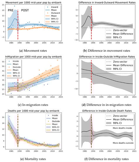 Figure 4 summarizes the results of events data analysis for three cases—inward/outward movement, inside/outside in-migration, and inside/outside mortality over time. The first column shows the individual event rate data modeled by independent Gaussian Processes. For each of these plots, the dots represent the normalized event rates per year, the solid lines represent the estimated means, and the shaded regions represent the 99% confidence interval. For each of these three cases, the second column shows the estimated differences in two event rates. The more the two event rates differ, the more the curve deviates from the zero-line, represented by the dotted black line. Finally, the dashed red line marks the pre- vs. post-embankment periods. For each of the second-row plots, within each embankment period, the confidence interval region helps us visually determine if the difference in event rates is statistically significant. If the confidence interval excludes the zero-line, the difference in event rates in this period is statistically significant. These test results are also summarized in Table 2.