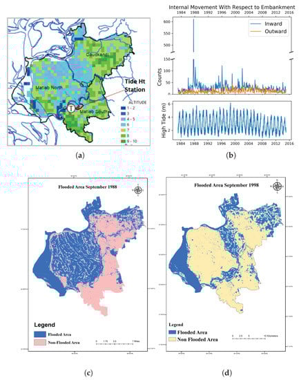 To fully understand the impact of embankment, it is important to link the socio-economic impacts with the hydro-climatic events. With about 47% of the land being low lying, the Meghna–Dhonagoda project area within Matlab North used to be regularly flooded in the monsoon up to a depth of 2–3 m in the pre-project condition [] (Saleh et al. 2000) (Figure 5b). In contrast, there is a lower proportion of low-lying land area in Matlab South (Figure 5b). While the low-lying areas get inundated during an average annual flood, the relatively higher lands are inundated only during moderate to extreme floods. Since Matlab South is only exposed to the Dhonagoda river, the area is relatively less vulnerable compared to other areas which are directly affected by floodwater from the large Meghna River.
