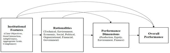 Even though water management and institutions have been identified as important concerns, and some of their features have been explored in the literature, no studies have examined the institutional arrangements in water through theoretical foundations of new institutional economics or management governance theory. A recent study has found the relevance of such foundations and has identified a set of characteristics including eight rationalities and five institutional features to be useful in explaining institutional performance []. However, the study does not examine how these characteristics interact with each other and what the relevant pathways across them are to determine performance on different goals and the overall success of the institution. This paper uses a structural equation modelling approach to examine this, bringing together the different characteristics identified by new institutional economics and management governance theories, and the various possibilities of interaction and pathways through them, to identify the critical interactions and pathways to institutional performance.