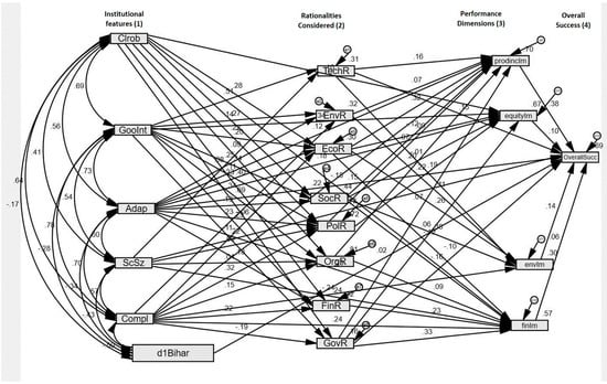 Physical development of irrigation has made considerable progress in India, but significant institutional weaknesses exist in the distribution of water, which greatly reduce efficiency and lead to a large gap between potential created and utilized in irrigation. The World Bank [] finds substantial weakness in the institutional arrangements in eastern India and emphasizes the importance of bringing cooperation of the stakeholders for better outcomes. It recommends a resource-led strategy with reformed and strengthened institutions. The research uses structural equation modelling to examine the nature and performance of participatory water institutions in the eastern Indo-Gangetic plains. The basic conceptualization comes from the foundations of new institutional economics and management governance theory, which indicate the importance of addressing a set of rationalities and institutional features to enhance institutional performance. However, it is not clear how they interact with each other and what the pathways are through them to successful outcomes. A structural equation model is used, which allows for interaction and pathways through various institutional characteristic to different performance outcomes.